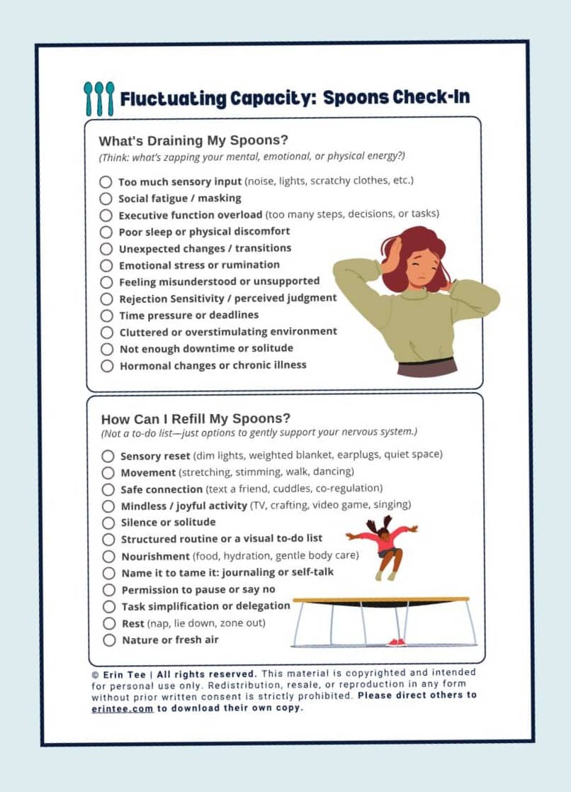 Feeling overwhelmed or burnt out? This free Spoons Check-In helps you identify what's draining your energy and how to recharge.